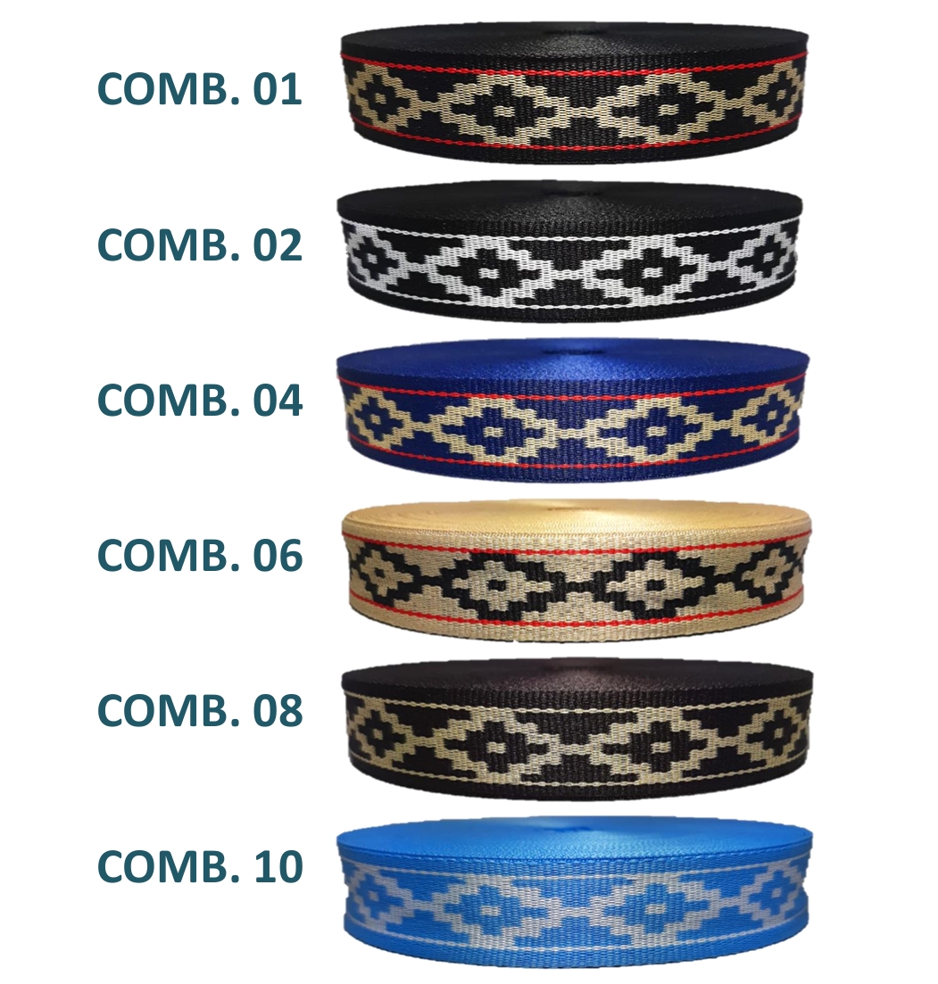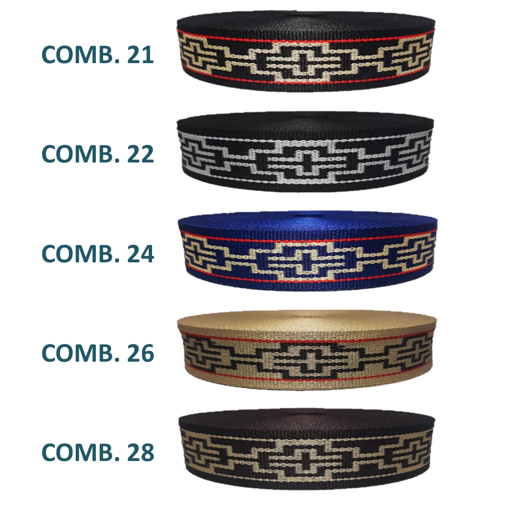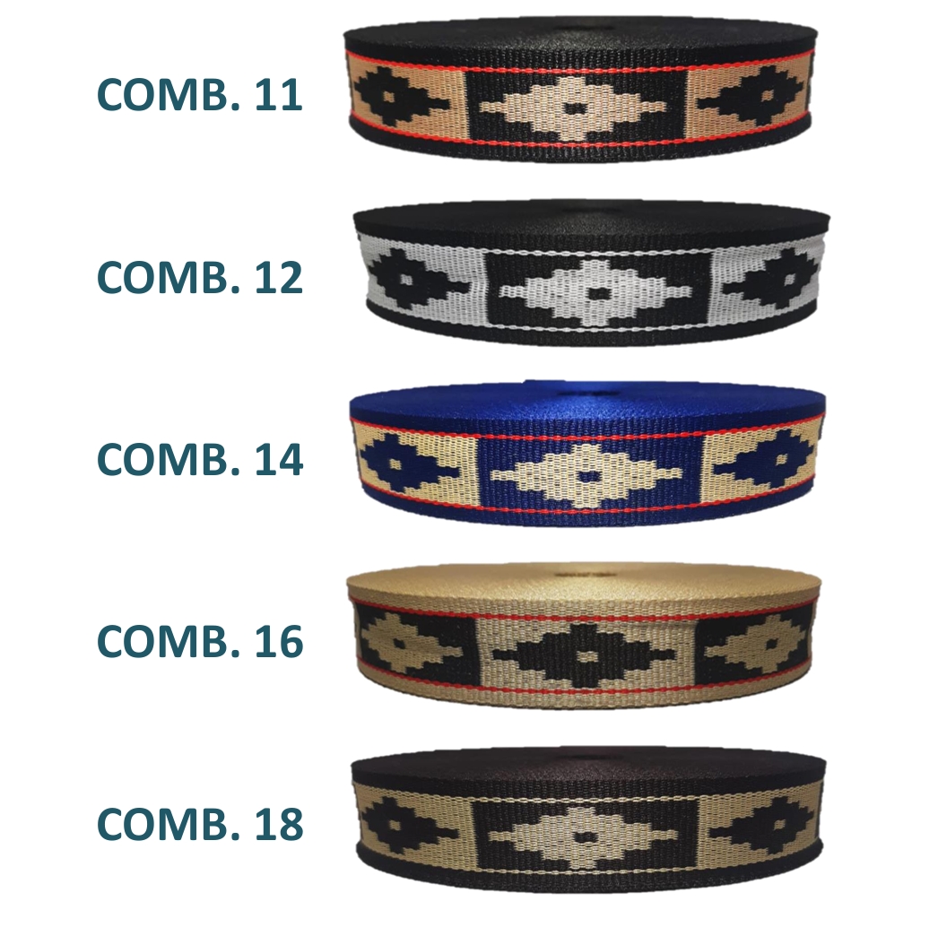 | Colores cinta pampa 28 mm | 01 Guarda negro con beige, 02 Guarda negro con blanco, 04 Guarda azul, 06 Guarda beige, 08 Guarda marrón, 10 Guarda celeste, 11 Rombo negro y beige, 12 Rombo negro y blanco., 14 Rombo azul, 16 Rombo beige, 18 Rombo marrón., 21 Cruz negro y beige., 22 Cruz negro y blanco, 24 Cruz azul, 26 Cruz beige, 28 Cruz marrón |