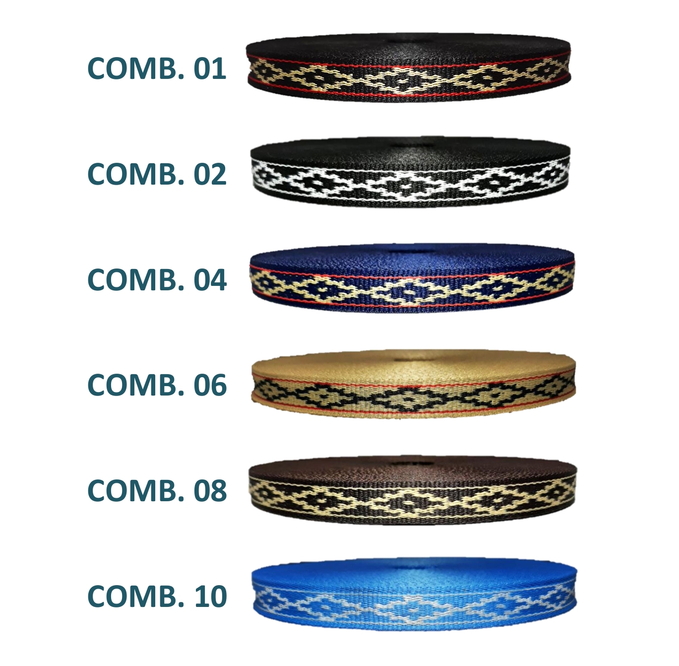 | Colores cinta pampa 12 mm | 01 Negro con detalle beige, 02 Negro con detalle blanco, 04 Azul con detalle beige, 06 Beige con detalle negro, 08 Marrón con detalle beige, 10 Celeste con blanco, Verde con detalle beige |