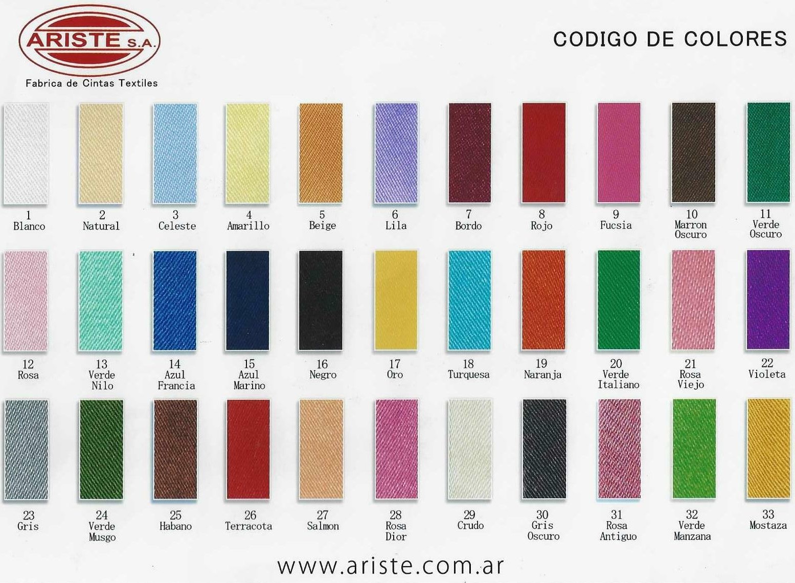 01 Blanco, 02 Natural, 03 Celeste, 04 Amarillo, 05 Beige, 06 Lila, 07 Bordó, 08 Rojo, 09 Fucsia, 10 Marrón oscuro, 11 Verde oscuro, 12 Rosa, 13 Verde nilo, 14 Azul Francia, 15 Azul marino, 16 Negro, 17 Oro, 18 Turquesa, 19 Naranja, 20 Verde italiano, 21 Rosa viejo, 22 Violeta, 23 Gris, 24 Verde musgo, 25 Habano, 27 Salmón, 28 Rosa dior, 29 Crudo, 30 Gris oscuro, 32 Verde manzana, 33 Mostaza, 36 Obispo, 37 Celeste bandera
